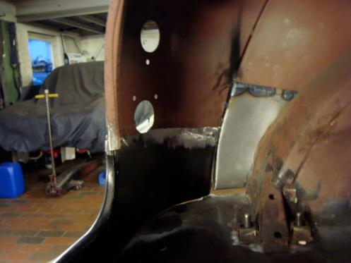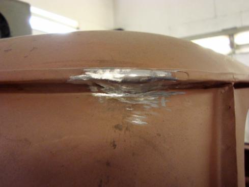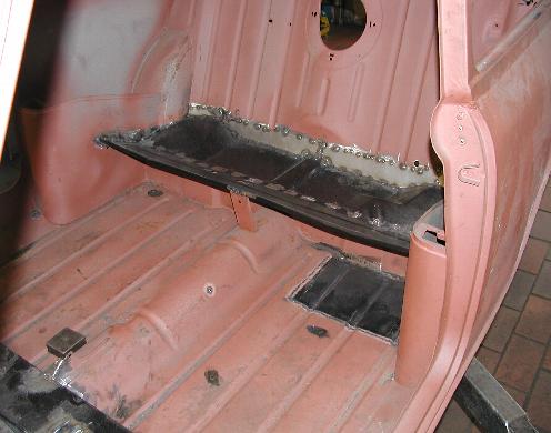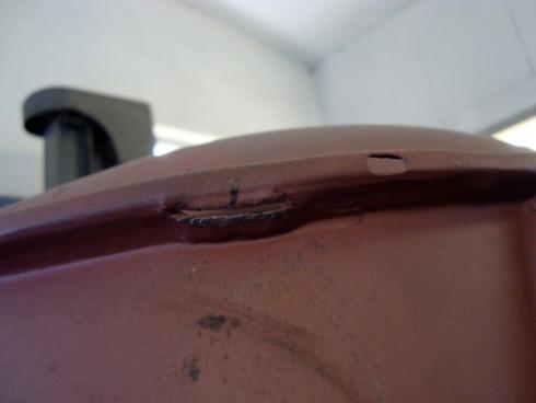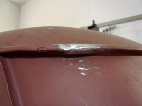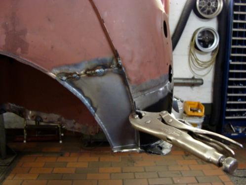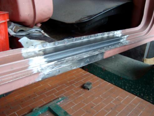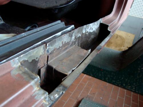 Der nach einem Überschlag verformte Schweller konnte nur durch heraustrennen des beschädigten Stückes repariert werden, da die frühen Schweller kastenförmig, und von innen nicht zugänglich sind.
