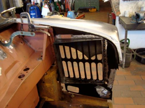 Weiter geht`s am Vorderwagen. Das Windleitblech wurde herausgeschnitten. Das Neuteil muss erst angepasst werden. Auch die Dreiecksbleche werden gegen neue getauscht.