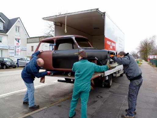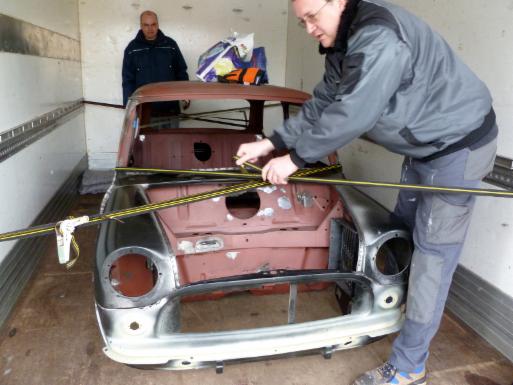 Mit Hilfe tatkräftiger Projektbegleiter konnte die Karosserie sicher verstaut und transportiert werden.