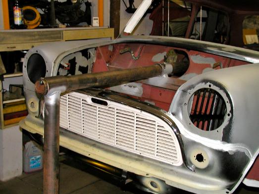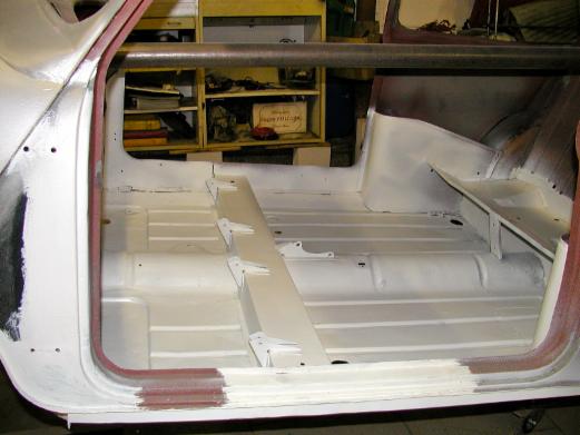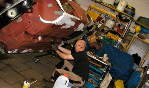Alle besonders gefährdeten Stellen der Karosserie werden mit einer Epoxyd-Grundierung behandelt. Erst punktuell, nach Demontage der Hauben und Türen erfolgt eine großflächige Behandlung in Radkästen, Innenraum usw . .